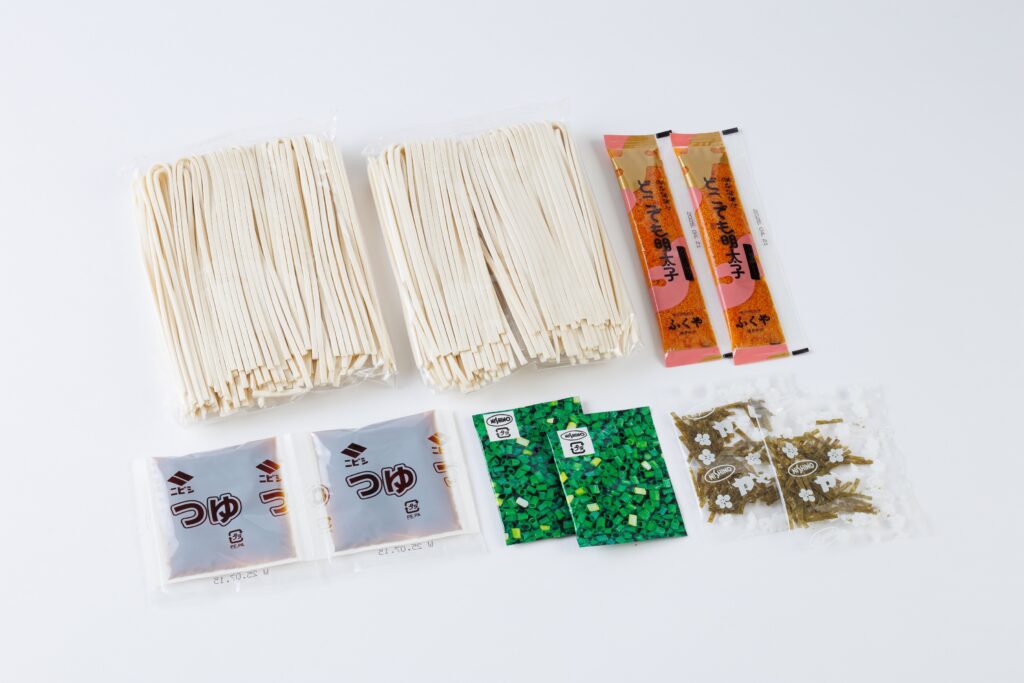 内容量2人前(めん 120g×2、つゆ 15g×2、辛子明太子油漬け 12g×2、刻のり 0.2g×2、乾燥ねぎ 0.15g×2)